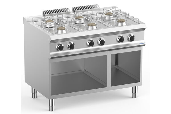 profesjonell gass solid topp med gass ovn. pilotflammen er beskyttet inne i hovedbrenneren. plasseringen av brennerne tillater bruk av panner opp til 40 cm i diameter. 60 % sertifisert effektivitet.