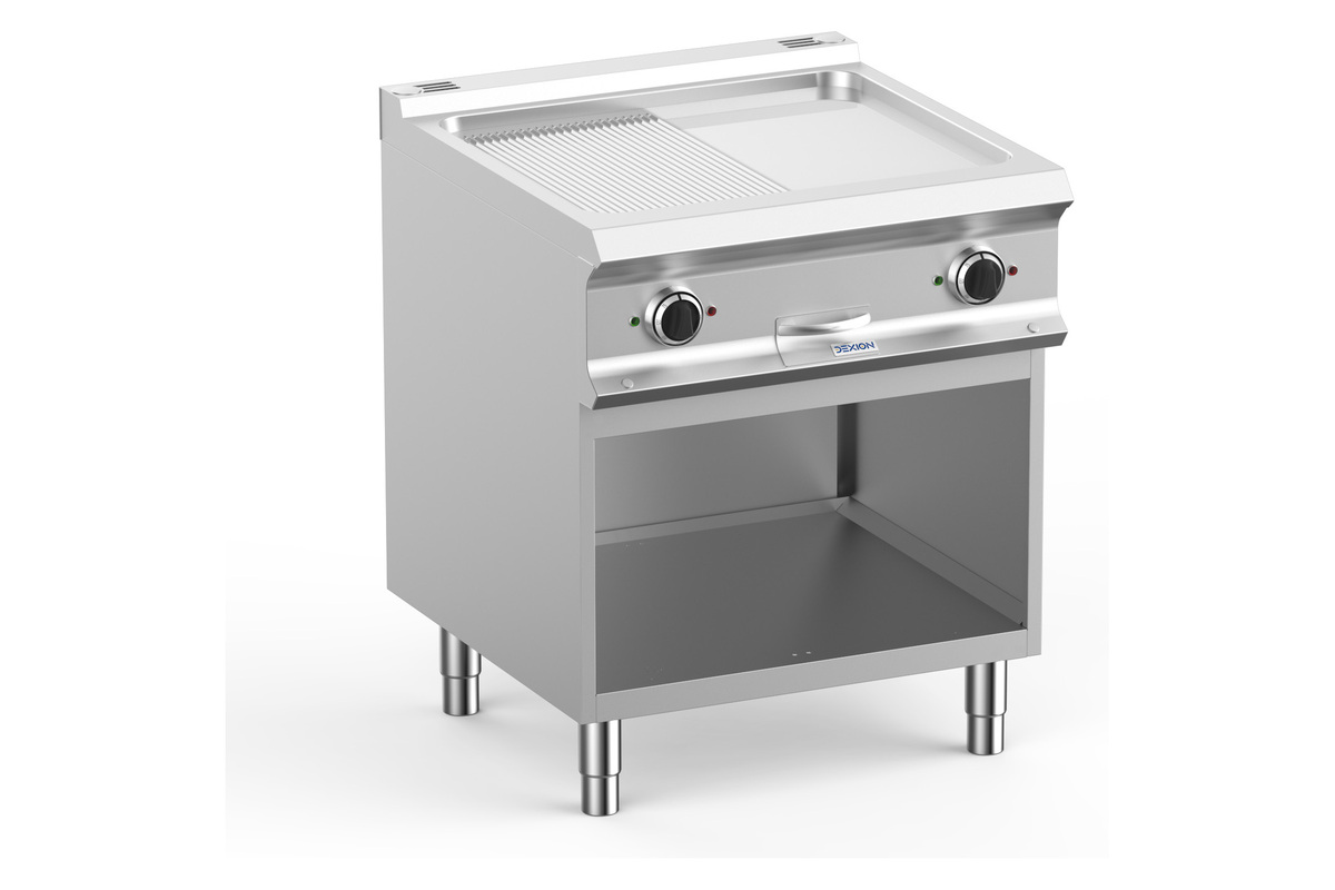 profesjonell elektrisk flatgrill, 1/2 rillet og 1/2 slett krom plate. bunn i rustfritt stål som garanterer bedre motstand. designet med vannbeskyttelse. ny avtagbar sprutbeskyttelse for å lette rengjøringen.