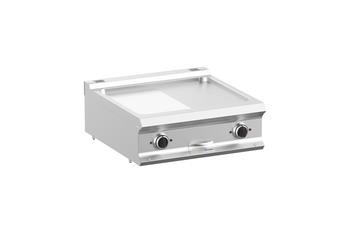 profesjonell elektrisk flatgrill, 1/2 rillet og 1/2 slett plate. bunn i rustfritt stål som garanterer bedre motstand. designet med vannbeskyttelse. ny avtagbar sprutbeskyttelse for å lette rengjøringen.