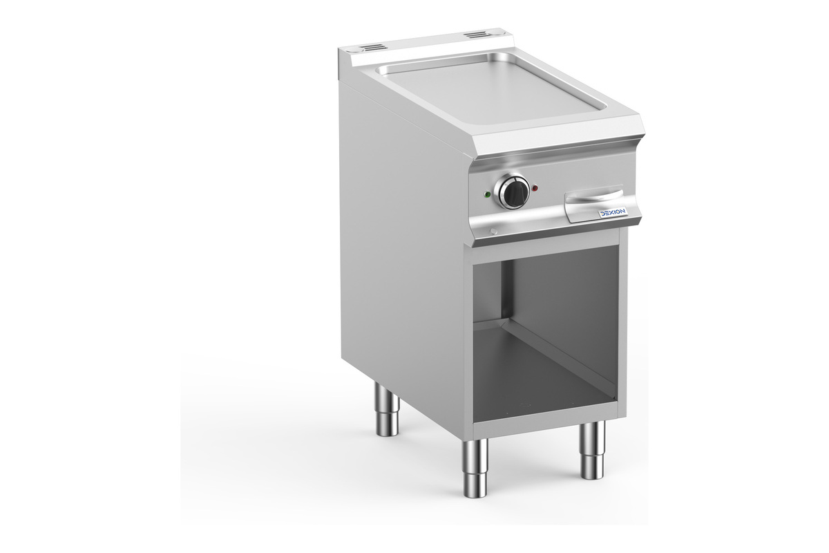 profesjonell elektrisk flatgrill med understell, 1 slett plate. bunn i rustfritt stål som garanterer bedre motstand. designet med vannbeskyttelse. ny avtagbar sprutbeskyttelse for å lette rengjøringen.
