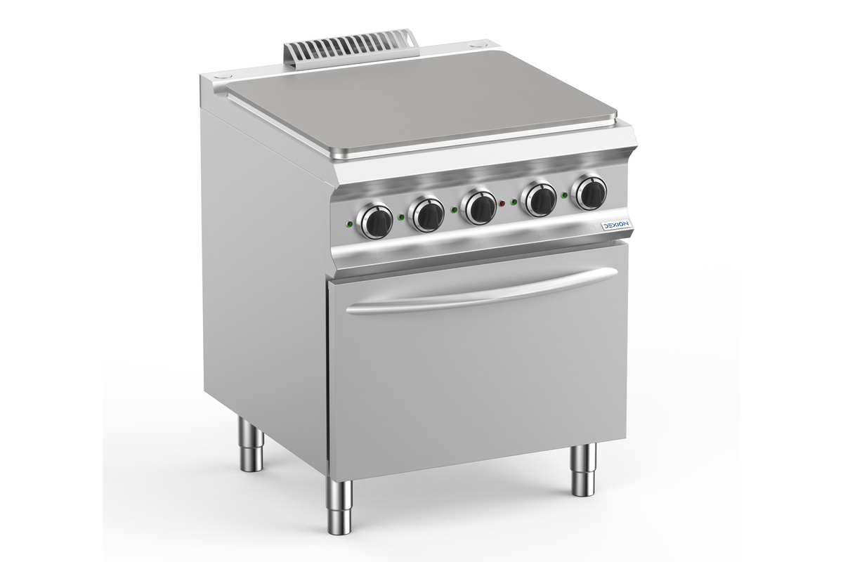 profesjonell elektrisk solid topp på elektrisk ovn. the cooking plate is unique but has 4 cooking zone with independent control. thermostatic temperature control for each cooking zone, from 80 to 450 degrees. stainless steel.